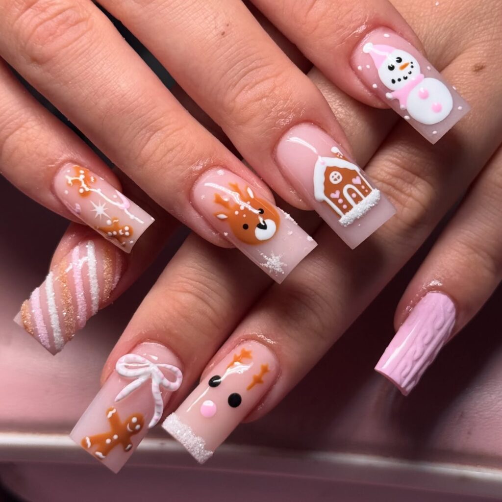 One nail is candy cane perfection, another has a snowy white snowflake on red, plus a gingerbread house nail and a white nail with a gingerbread man — a full Christmas story on your hands.